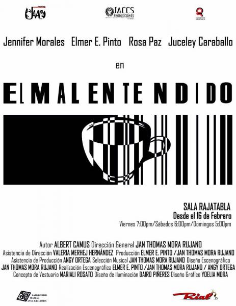 El Malentendido, de Albert Camus, fue estrenada en la Sala Rajatabla de la Fundación Rajatabla, el 16 de febrero de 2018, bajo la producción del Grupo de Teatro Jóvenes Actores de Vargas, junto a la Asociación Civil JACCS Producciones y el apoyo institucional de la Fundación Rajatabla, con el siguiente reparto: