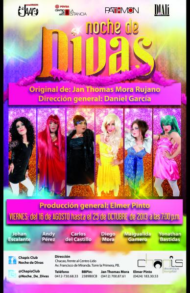 Noche de Divas*, de Jan Thomas Mora Rujano, fue estrenada el 16 de agosto de 2013, en Chapis Club (Ubicado en Chacaito), bajo la producción de Grupo de Teatro Jóvenes Actores de Vargas (J.A.VAR.) y coproducción de D!Alí Producciones y Pathmon Producciones, con el siguiente reparto: