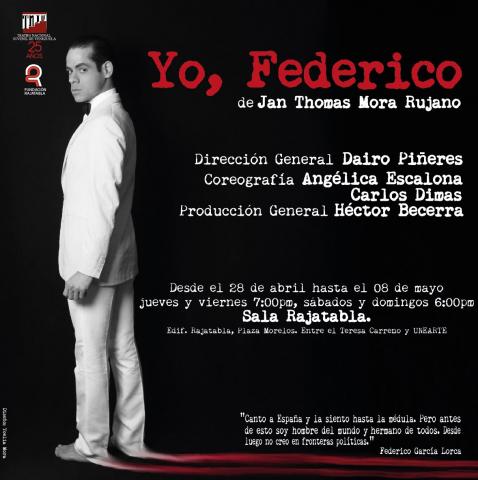 Yo, Federico fue estrenado el 07 de octubre de 2015 en la Sala Anna Julia Rojas de la Universidad Nacional Experimental de las Artes UNEARTE, por el Grupo Teatro Nacional Juvenil de Venezuela (TNJV), en conmemoración de los 25 años de trayectoria artística de la agrupación. Contó con el siguiente reparto: